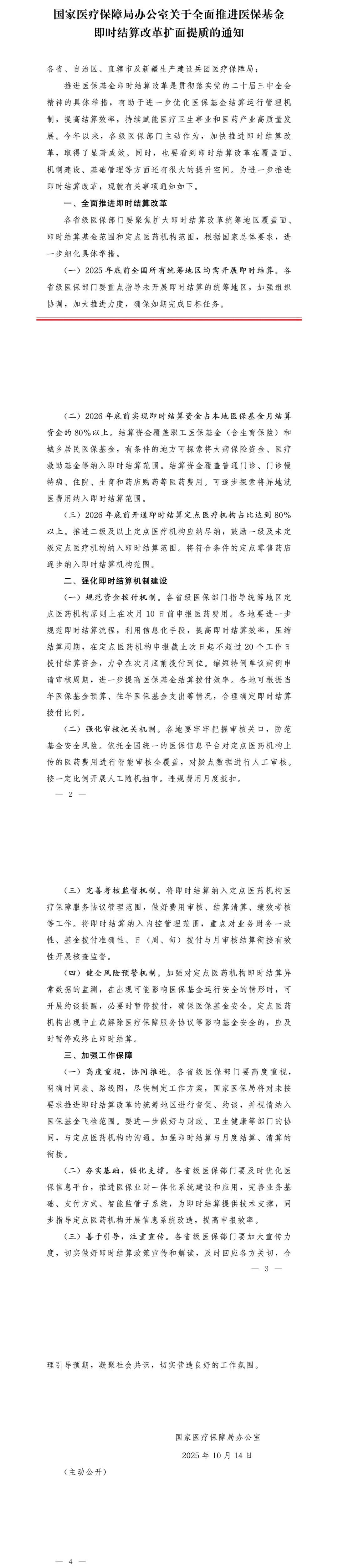 國家保障局辦公室關(guān)于全面推進(jìn)醫(yī)保基金即時(shí)結(jié)算改革擴(kuò)面提質(zhì)的通知